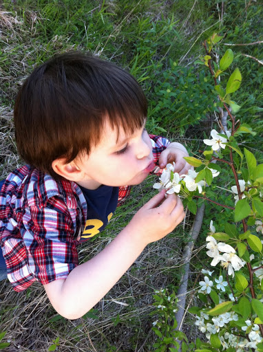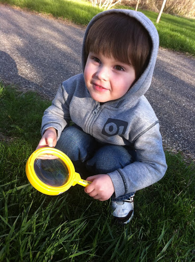 Walking with a three-year-old is quite an experience. I don’t get to walk as fast as I normally would like. It’s not quite as much of a work-out as it is when I walk by myself, but there’s so much more that I notice when I walk with Aaron. He finds interest in what I think is mundane. He needs to stop and look at the grass, the “fuzzies” (i.e. dandelions), and the pretty rocks. He likes to stop to listen to the birdies sing, and of course, he stops to smell the flowers. And it’s really fun to bring a magnifying glass and make things bigger.